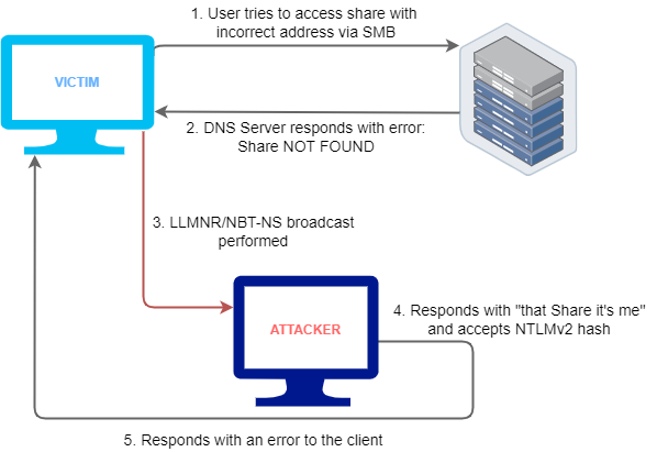 When a user tries to access a share, and the IP does not exist or is not recognized, an attacker on the network declares itself as being that IP, and the system tries to connect with the keys to the attacker, thus providing the user and the hash.