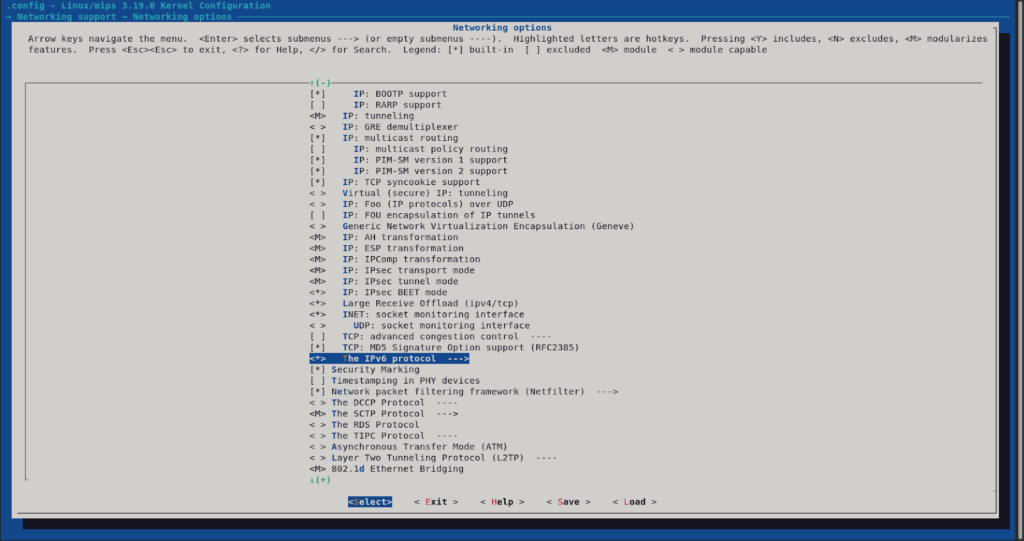 In this case, we were trying to use the kernel image with an “external” root filesystem extracted from a router firmware binary package. We needed to embed the IPv6 kernel object (driver) in the kernel since we will not be loading the kernel object (.ko) files from the root filesystem. For this simple change, we will have to customize the linux kernel configuration.