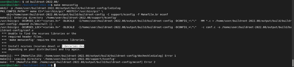 The following screenshots show the build process error messages stating the missing dependencies. First is missing libncurses-dev, for menuconfig target.