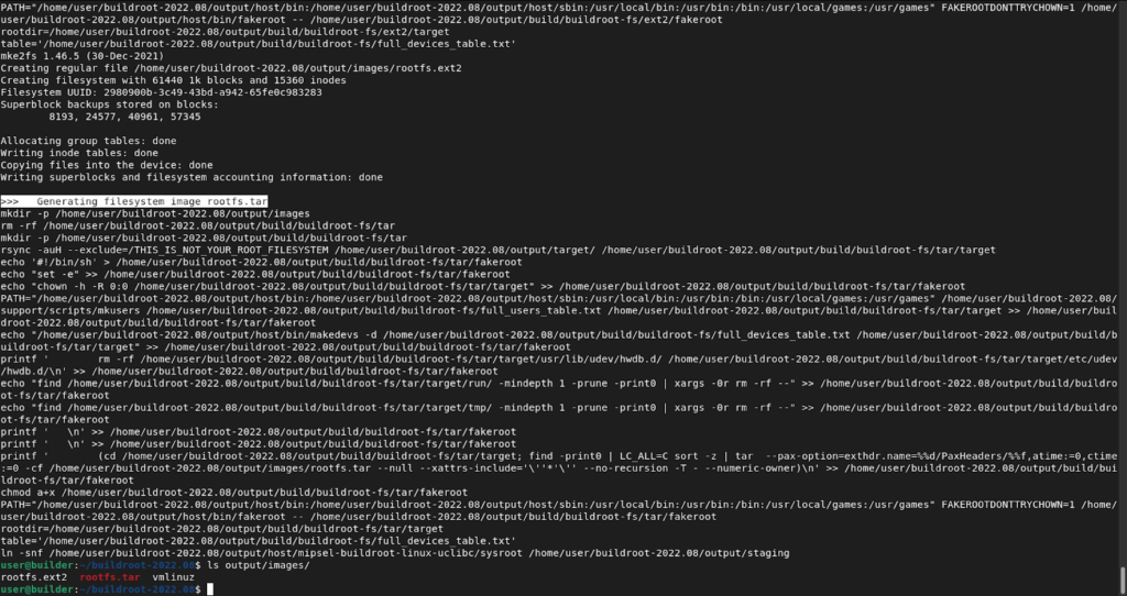 This time there were no more errors and the filesystem and kernel images were finally successfully built. The final images will be at output/images/ directory inside buildroot root directory.