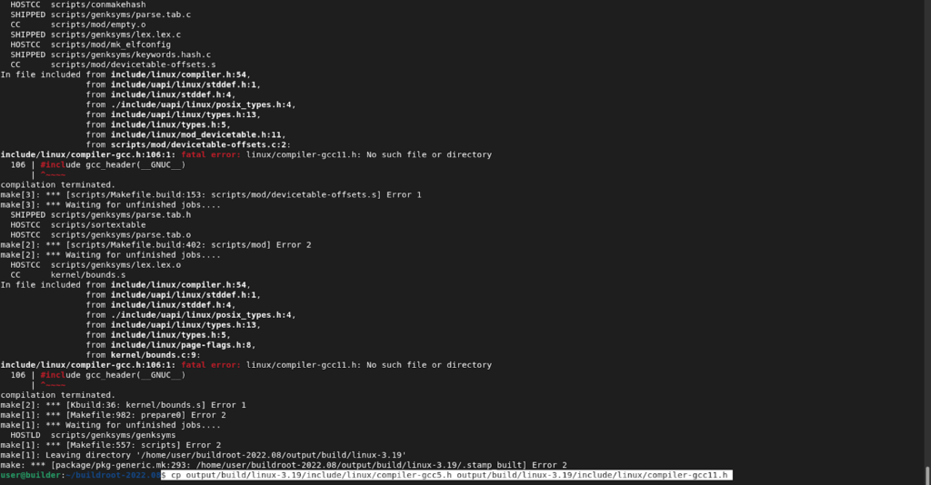 The first one was the following error: this older version of the kernel was not compatible with the newer GCC compiler version. Still, we were able to compile by copying the last version GCC header of linux/compiler-gcc.h to the filename missing, in this case, linux/compiler-gcc5.h to linux/compiler-gcc11.h. This kernel was supposed to be compiled with GCC version 5 and we are using 11. The include is using a macro to expand the version of the current GCC in use.