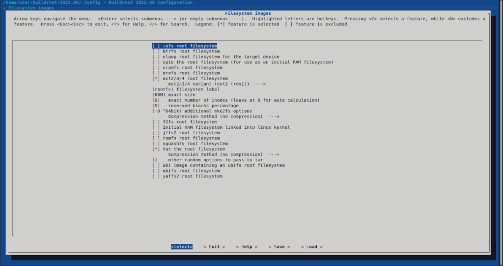 On “Filesystem images” we also enabled the “ext2/3/4 root file system” to create another filesystem root image in that format. In this case, we will have an ext2 volume image and a tar file with the root filesystem we are building.