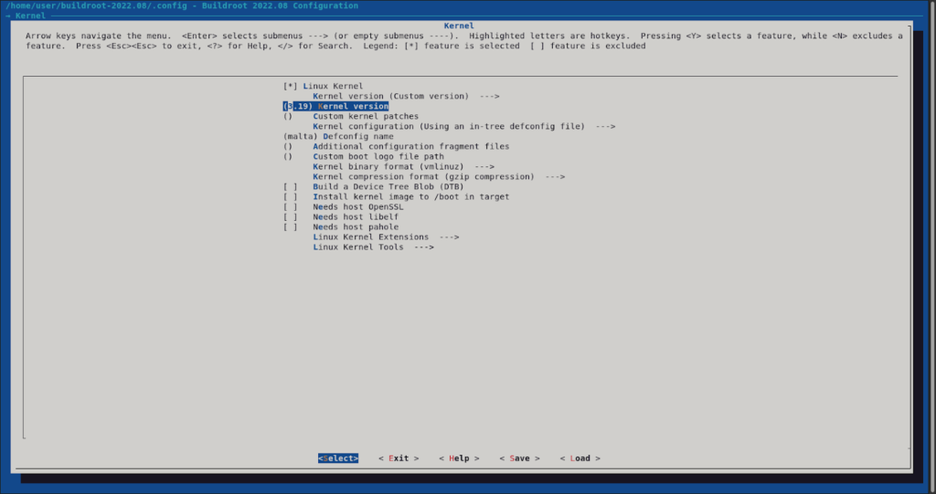 We will build a Linux kernel image along the root filesystem. So we checked the “Linux kernel” option, configured the kernel version to 3.19, set the defconfig name to “malta” (for qemu target), and changed “Kernel binary format” to vmlinuz. We got the following screenshot after configuration.
