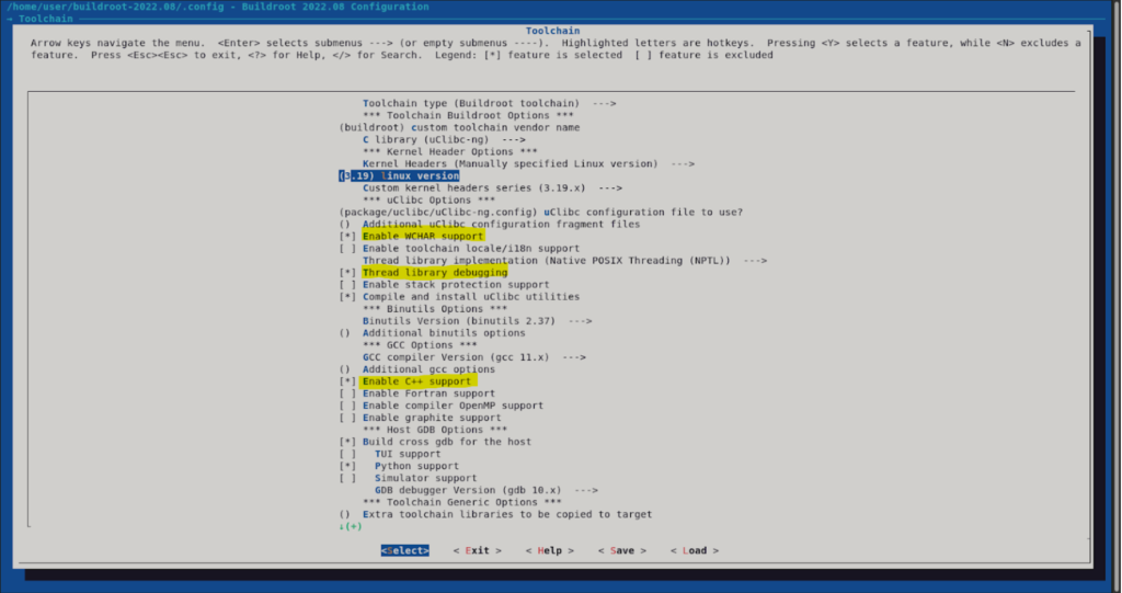 On the “Toolchain” menu we must enable the following items: