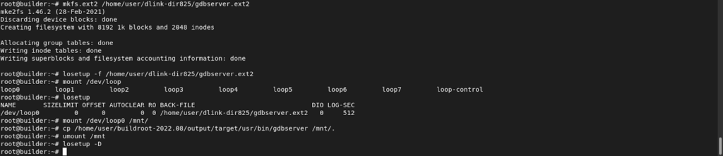 # cp /home/user/buildroot-2022.08/output/target/usr/bin/gdbserver /mnt/.